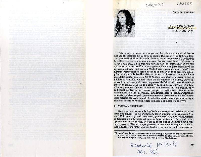 Emily Dickinson, Gabriela Mistral y su público [artículo] Elizabeth Horan.