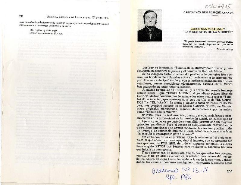Gabriela Mistral y "Los sonetos de la muerte" [artículo] Gastón von dem Bussche Aranda.