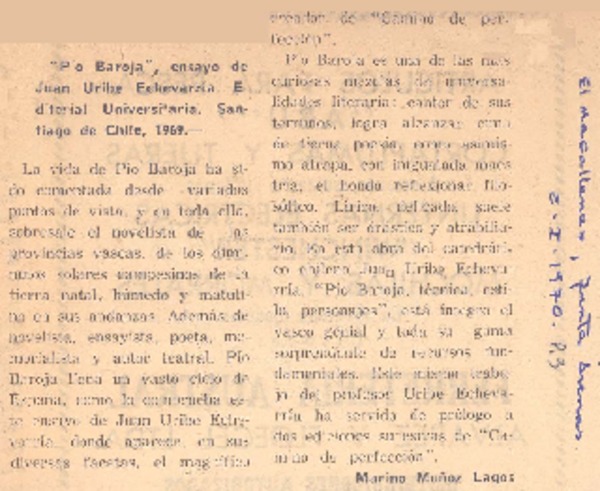 "Pío Baroja" [artículo] Marino Muñoz Lagos.