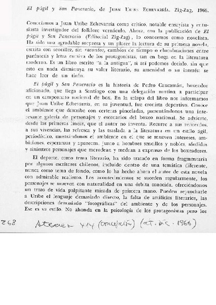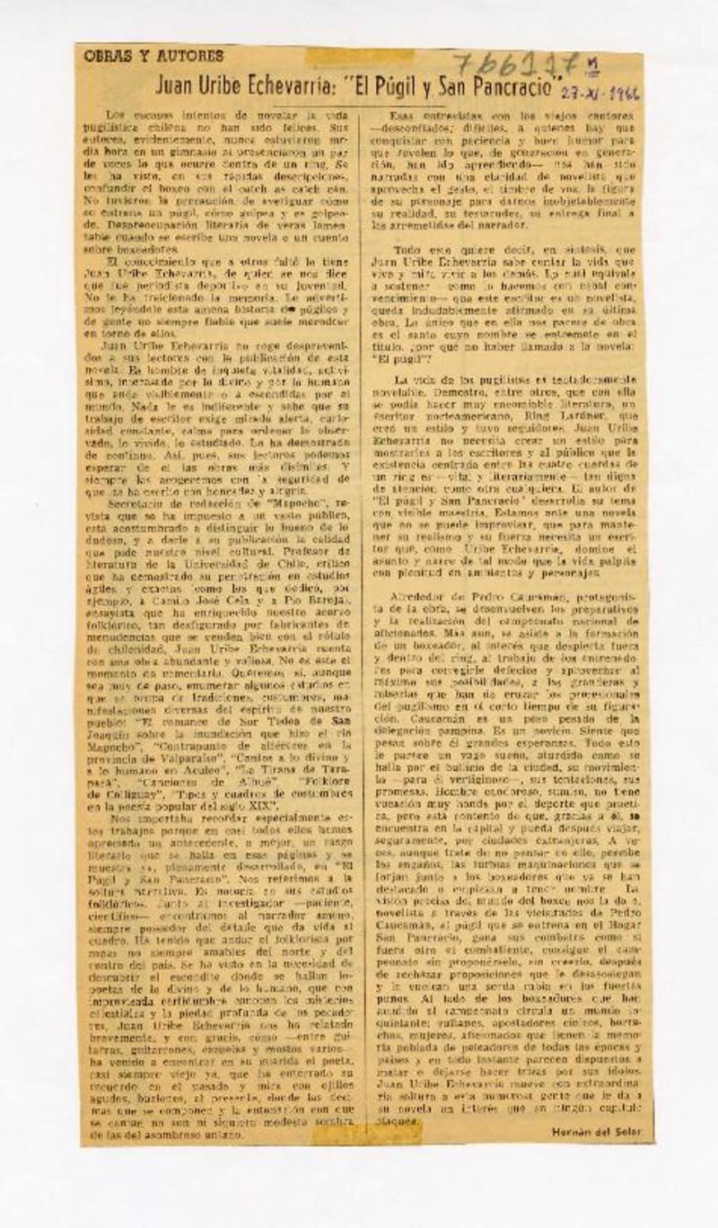 Juan Uribe Echevarría, "El púgil y San Pancracio" [artículo] Hernán del Solar.