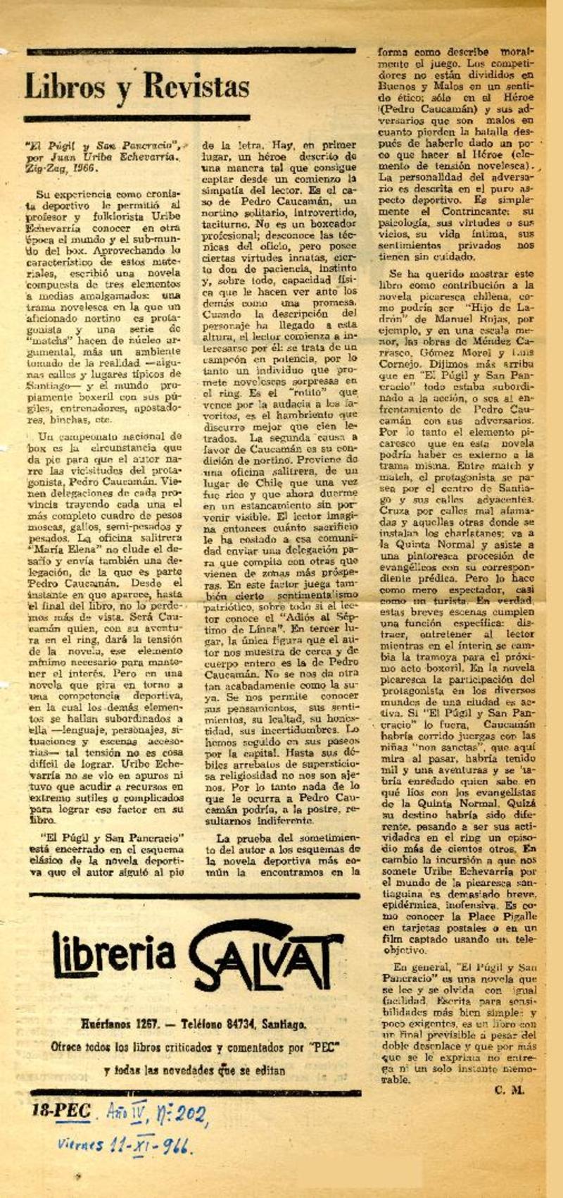 Autores chilenos - Uribe Echevarria, Juan - Pugil y San Pancracio