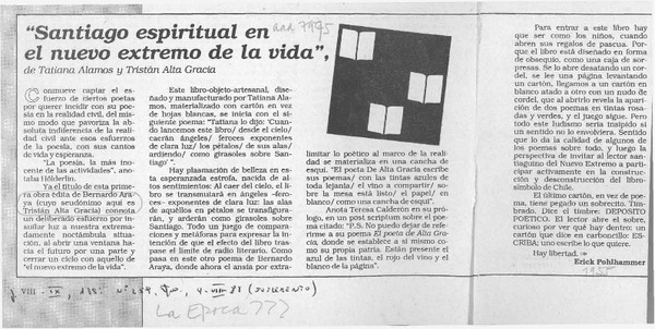 "Santiago espiritual en el nuevo extremo de la vida" [artículo] Erick Pohlhammer.