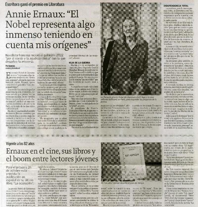 Annie Ernaux: "El Nobel representa algo inmenso teniendo en cuenta mis orígenes" [artículo].