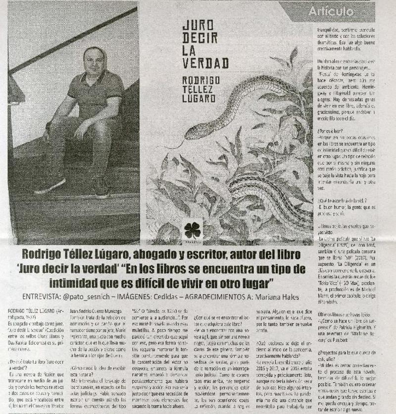 Rodrigo Téllez Lúgaro, abogaro y escritor, autor del libro 'Juro decir la verdad' "En los libros se encuentra un tipo de intimidad que es difícil de vivir en otro lugar" [entrevista] [artículo] : @pato_sesnich.