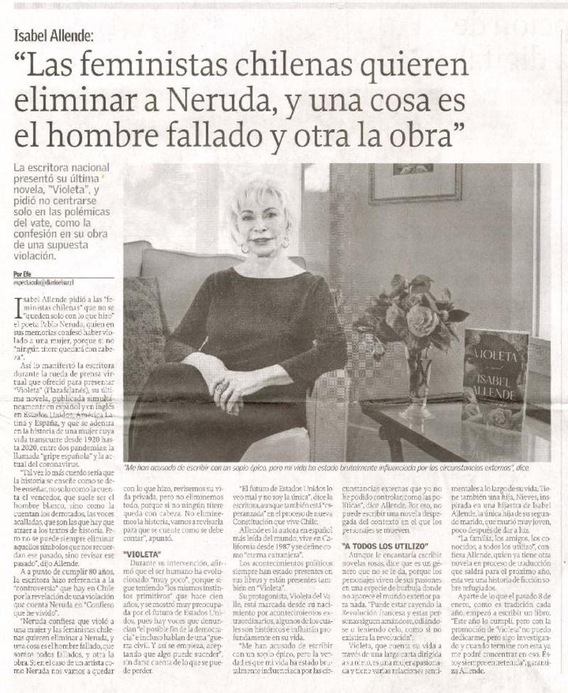 Isabel Allende: "Las feministas chilenas quieren eliminar a Neruda, y una cosa es el hombre fallado y otra la obra" [artículo]