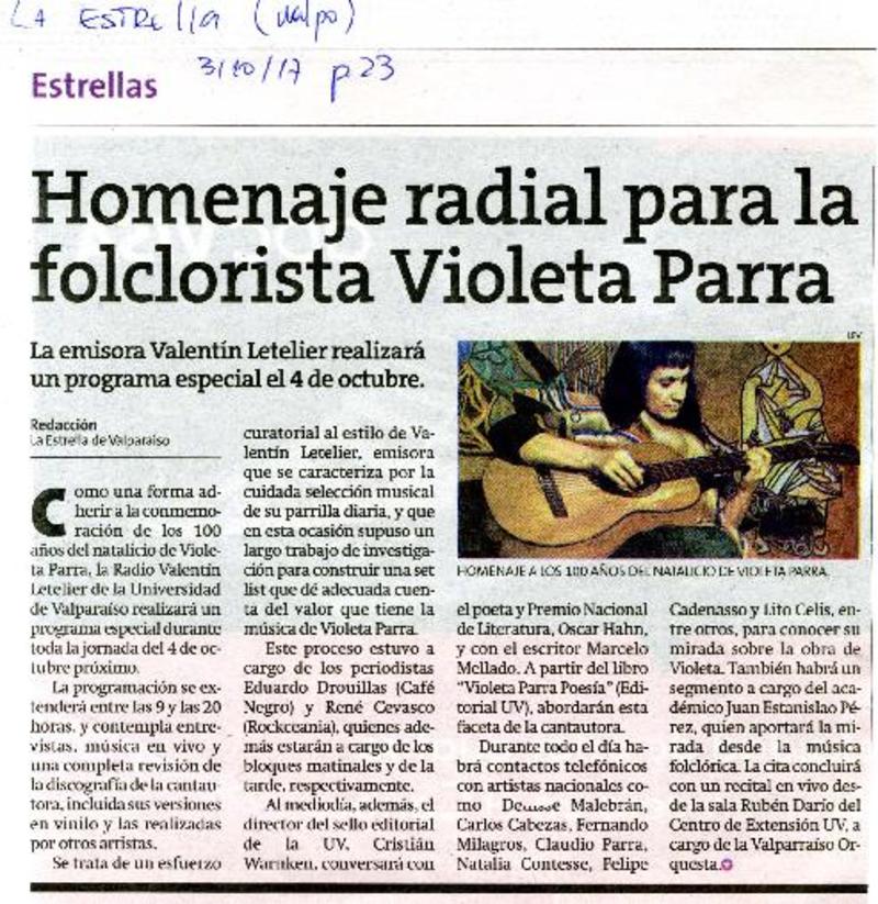 Homenaje radial para la folclorista Violeta Parra [artículo]