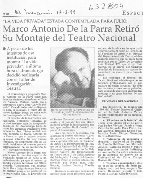 Marco Antonio de la Parra retiró su montaje del teatro nacional [artículo]