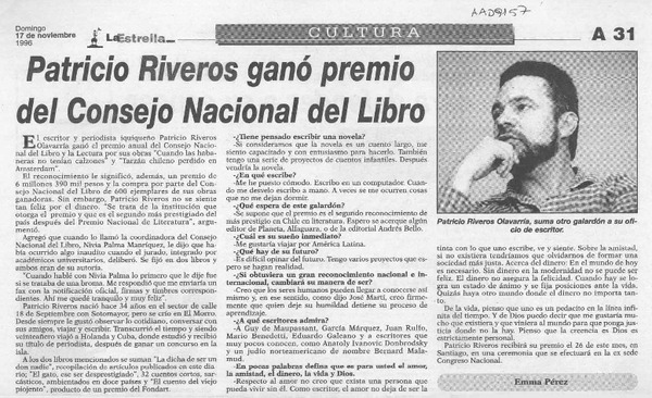 Patrico Riveros ganó premio del Consejo Nacional del libro [artículo] Emma Pérez.