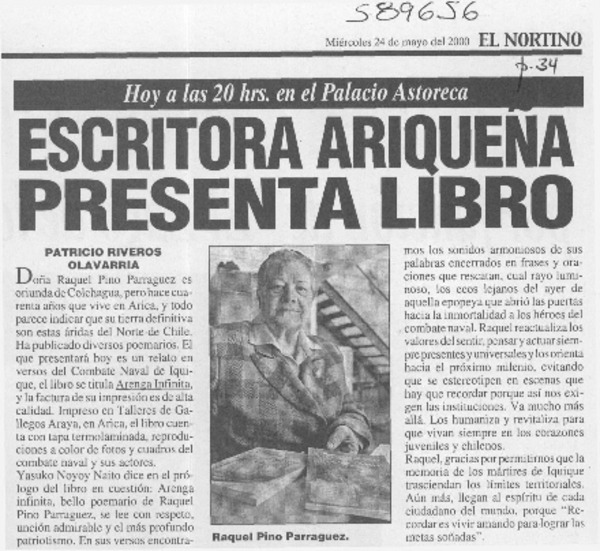Escritora ariqueña presenta libro [artículo] Patricio Riveros Olavarría
