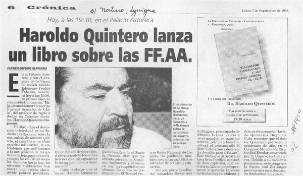 Haroldo Quintero lanza un libro sobre las FF.AA. [artículo] Patricio Riveros Olavarría.