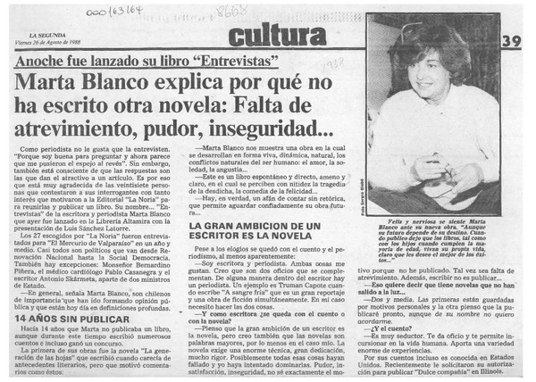 Marta Blanco explica por qué no ha escrito otra novela, falta de atrevimiento, pudor, inseguridad -- [artículo].