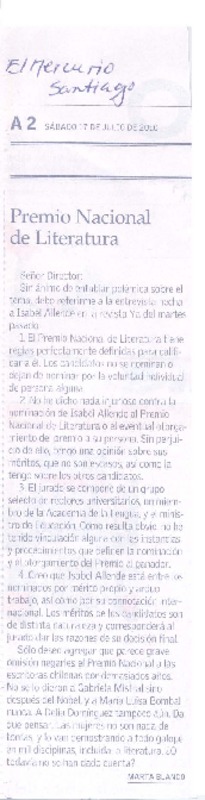 Premio Nacional de Literatura [artículo] Marta Blanco.