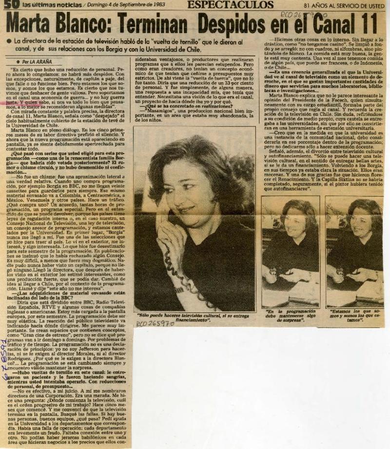 Marta Blanco, terminan despidos en el Canal 11: [entrevista] [artículo] : La Araña.