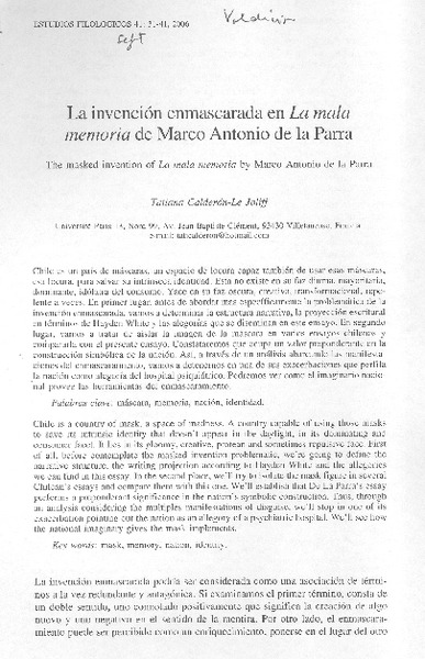La invención enmascarada en La mala memoria de Marco Antonio de la Parra [artículo] Tatiana Calderón-Le Joliff.