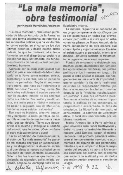 "La mala memoria", obra testimonial [artículo] Horacio Hernández Anderson.