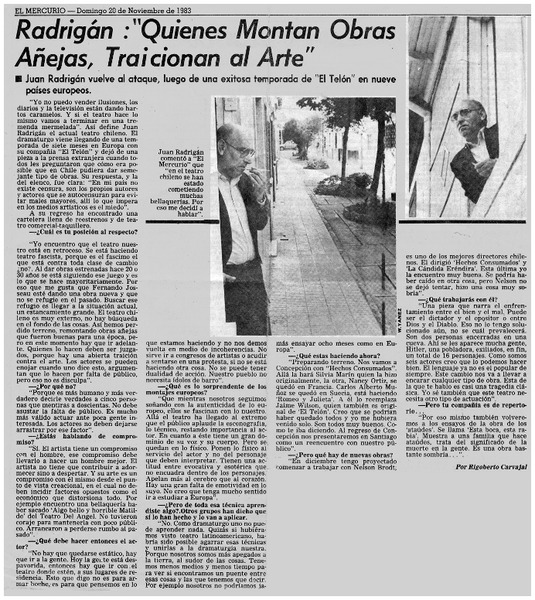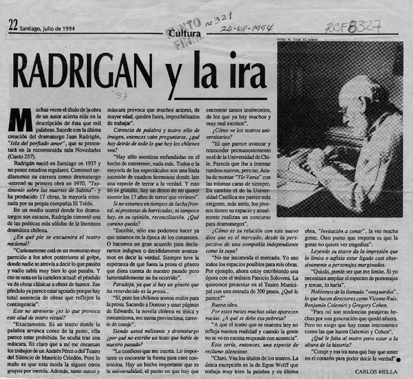 Radrigán: "quienes montan obras añejas, traicionan al arte" [entrevistas] [artículo] Rigorberto Carvajal.