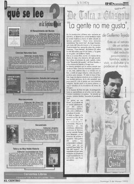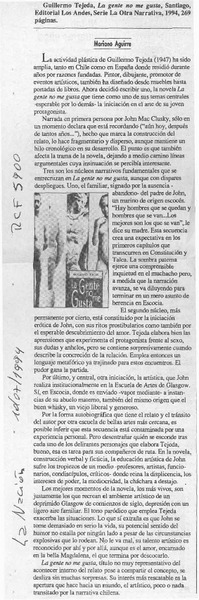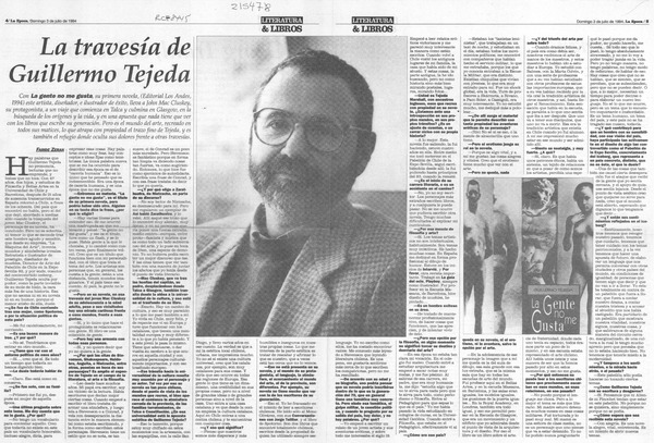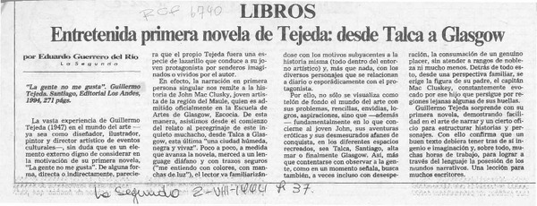 Entretenida primera novela de Tejeda, desde Talca a Glasgow [artículo] Eduardo Guerrero del Río.