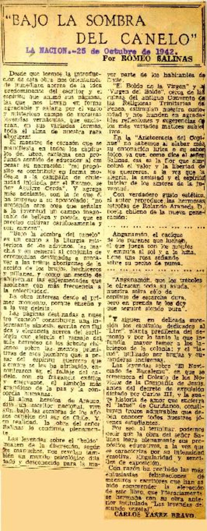 "Bajo la sombra del canelo" [artículo] Carlos Yáñez Bravo.