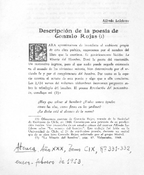 Descripción de la poesía de Gonzalo Rojas [artículo] Alfredo Lefebvre.