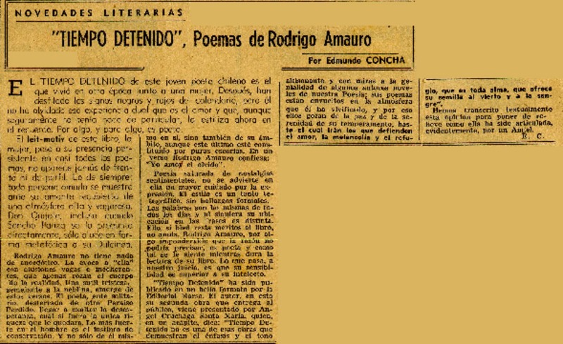 "Tiempo detenido", poemas de Rodrigo Amauro [artículo] Edmundo Concha.