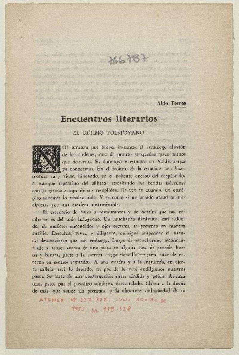 Encuentros literarios : el último Tolstoyano [artículo] Aldo Torres Púa.
