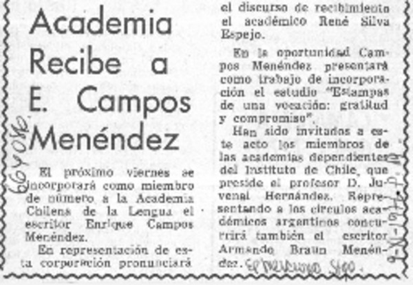 Académia recibe a E. Campos Menéndez. [artículo]