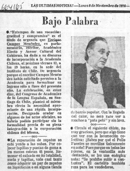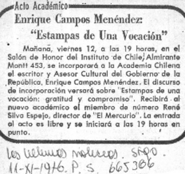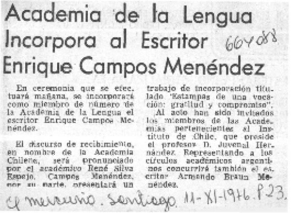 Academia de la Lengua incorpora al escritor Enrique Campos Menéndez. [artículo]