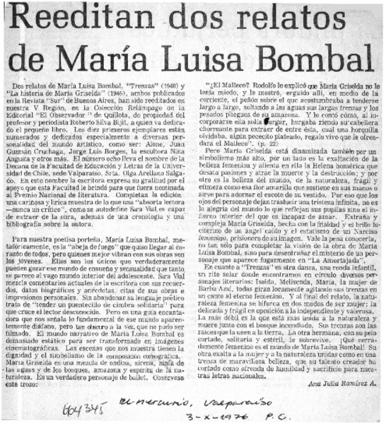 Un nuevo libro de María Luisa Bombal. [artículo]