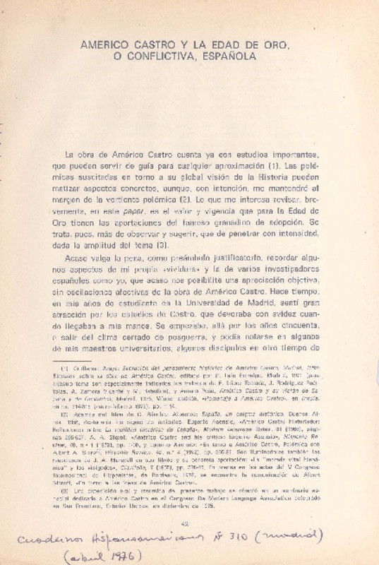 Américo Castro y la edad de oro, o conflictiva, española [artículo] Alberto Porqueras-Mayo.