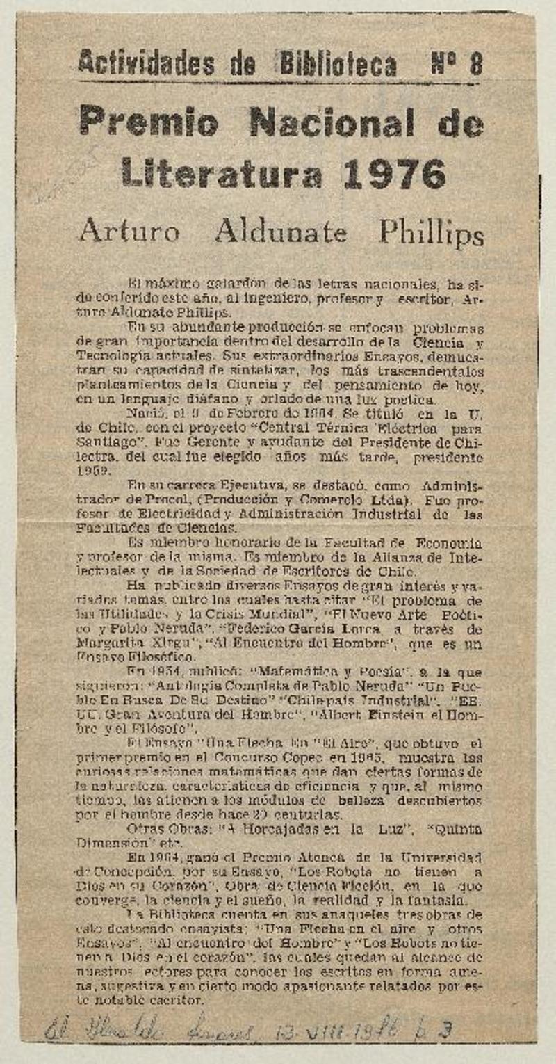 Alduante Phillips, Premio Nacional. [artículo]