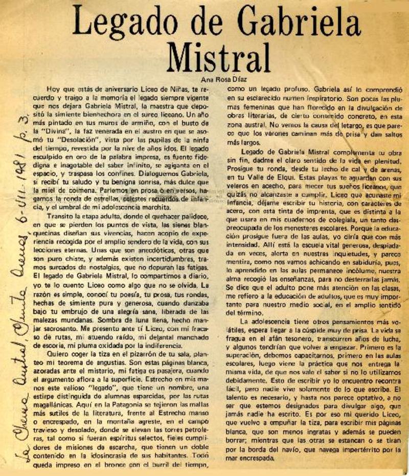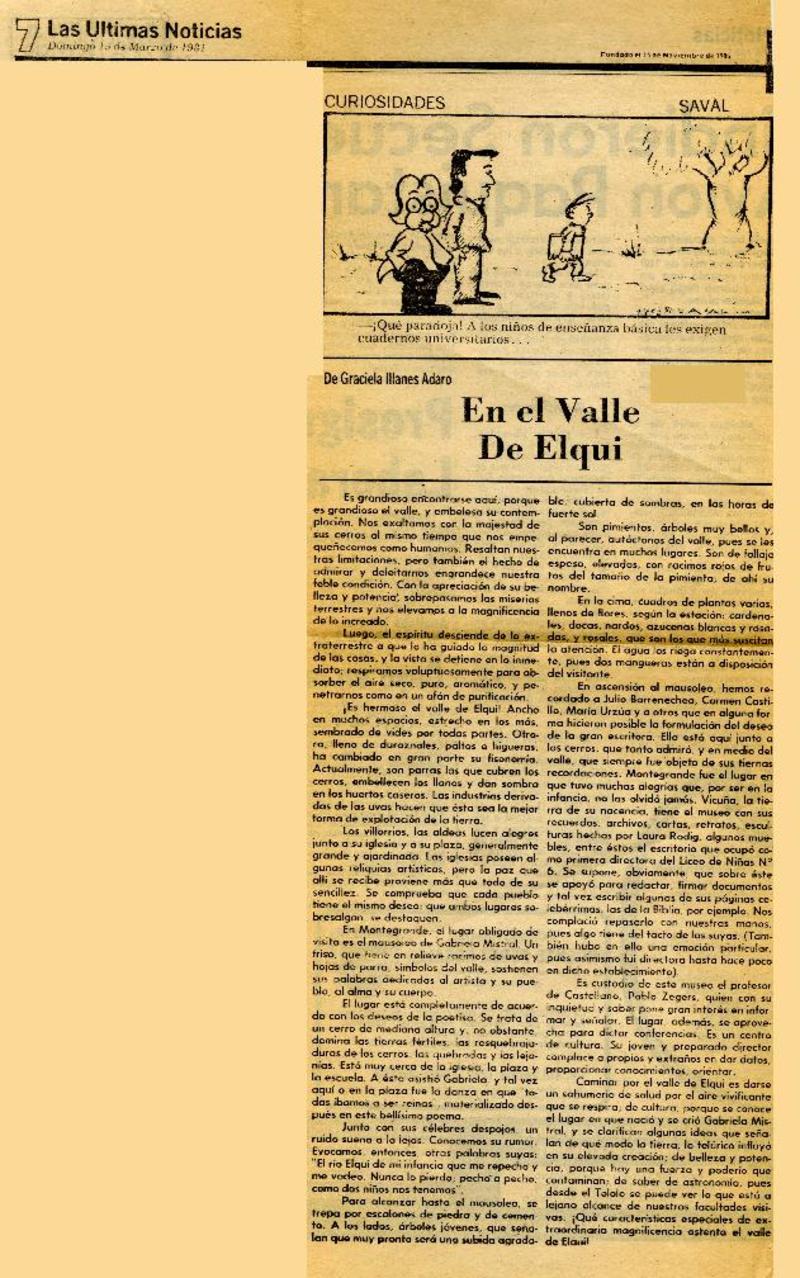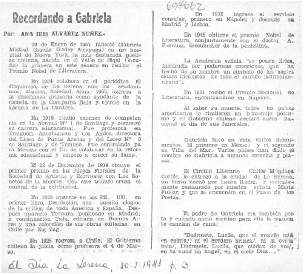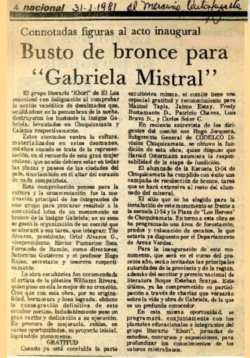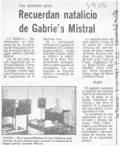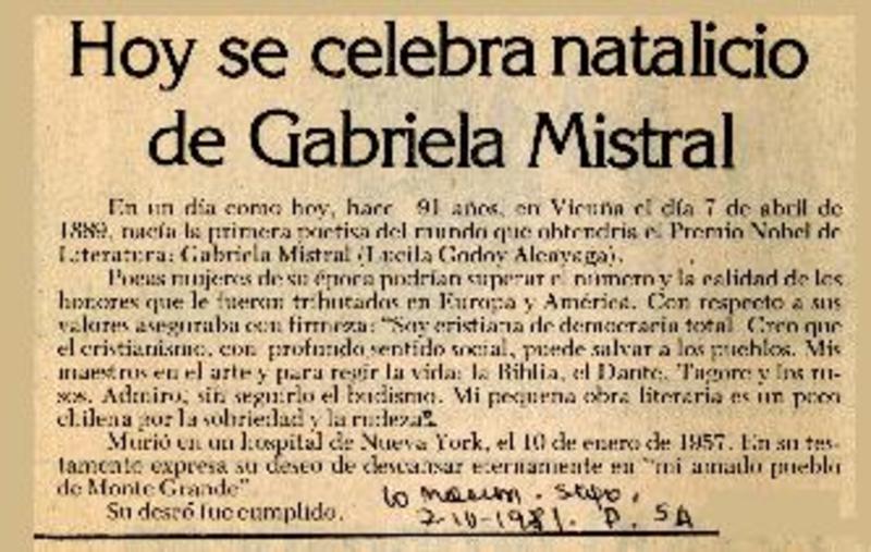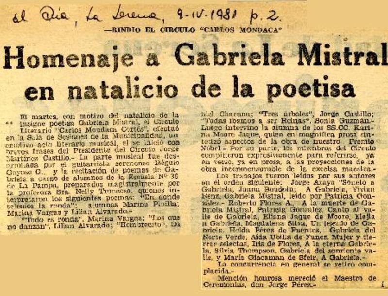 Vicuña recordó el natalicio de poetisa Gabriela Mistral [artículo] Guillermo Alcayaga.