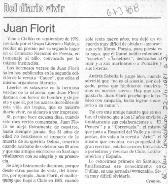 Adiós al poeta Juan Florit [artículo] Carlos Ruíz Zaldívar.