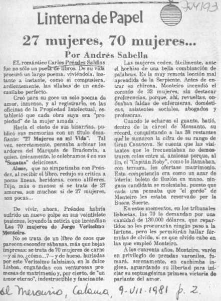 27 mujeres, 70 mujeres-- [artículo] Andrés Sabella.