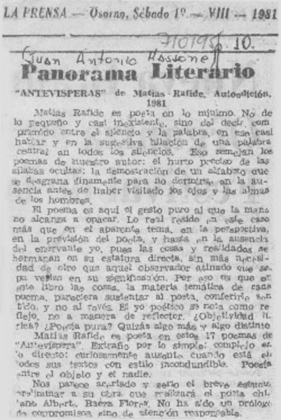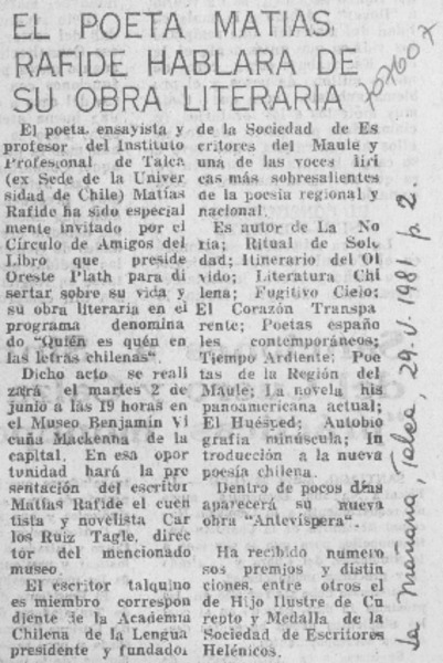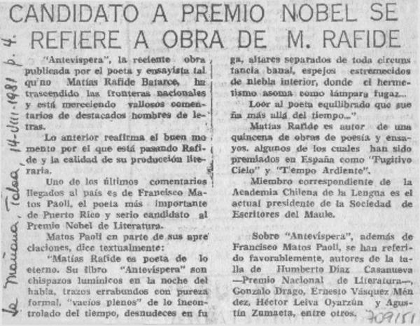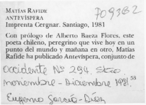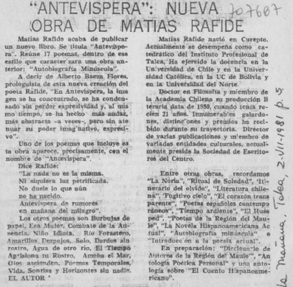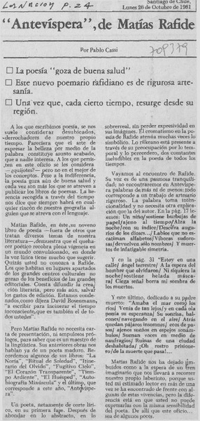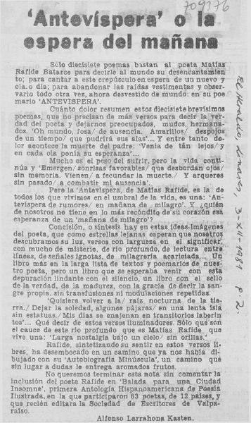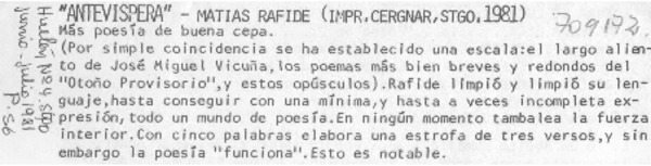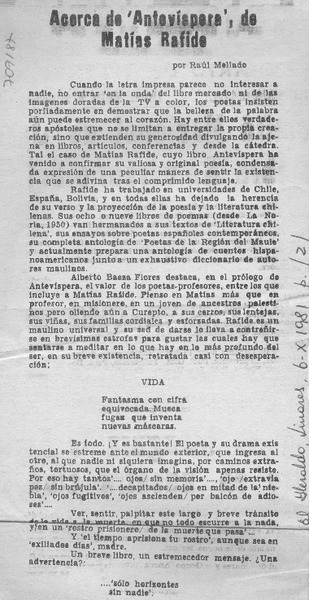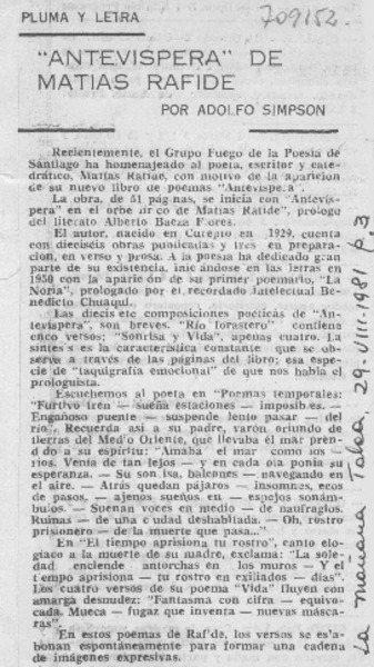 Acerca de "Antevíspera", de Matías Rafide [artículo] Raúl Mellado.