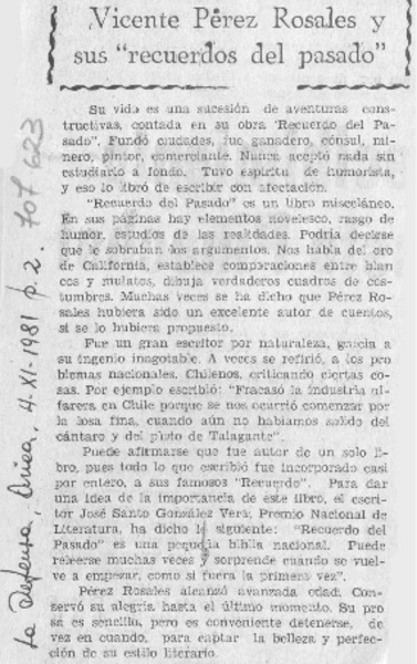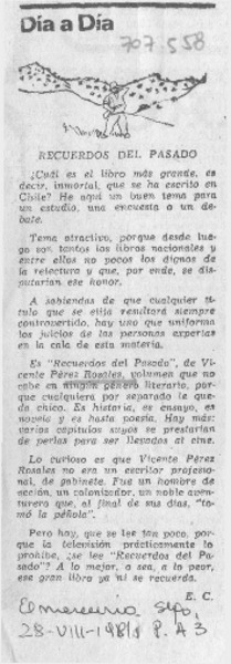 Vicente Pérez Rosales y sus "recuerdos del pasado". [artículo]