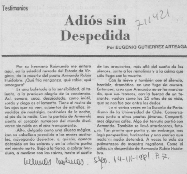 Adiós sin despedida [artículo] Eugenio Gutiérrez Arteaga.