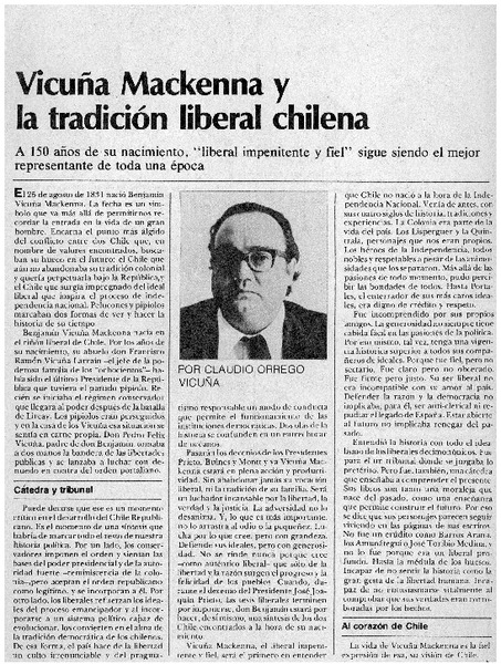 Vicuña Mackenna y la tradición liberal chilena [artículo] Por, Claudio Orrego Vicuña.