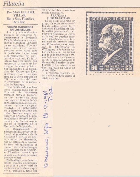 Vicuña Mackenna en los sellos [artículo] Manuel del Villar.