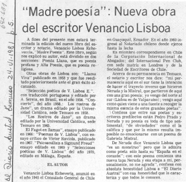 Autores chilenos - Lisboa, Venancio - Madre poesía