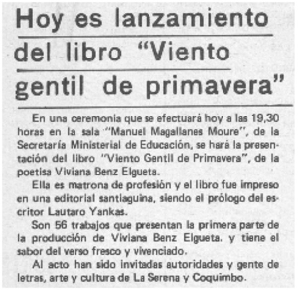 Viviana Benz, un virtuoso dar a la luz en la poesía [artículo] Benjamín Morgado.