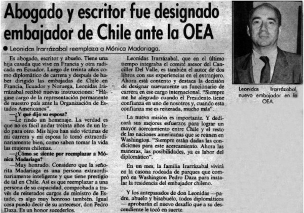Abogado y escritor fue designado embajador de Chile ante la OEA : [entrevistas] [artículo]