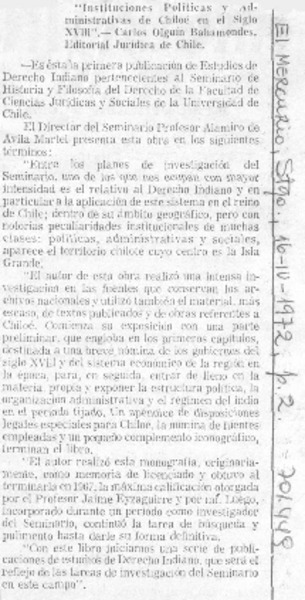Autores chilenos - Olguín Bahamondes, Carlos - Instituciones políticas y administrativas de Chiloé en el siglo XVIII