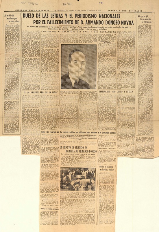 Duelo de las letras y el periodismo nacionales por el fallecimiento de D. Armando Donoso Novoa [artículo] Andrés González Blanco.