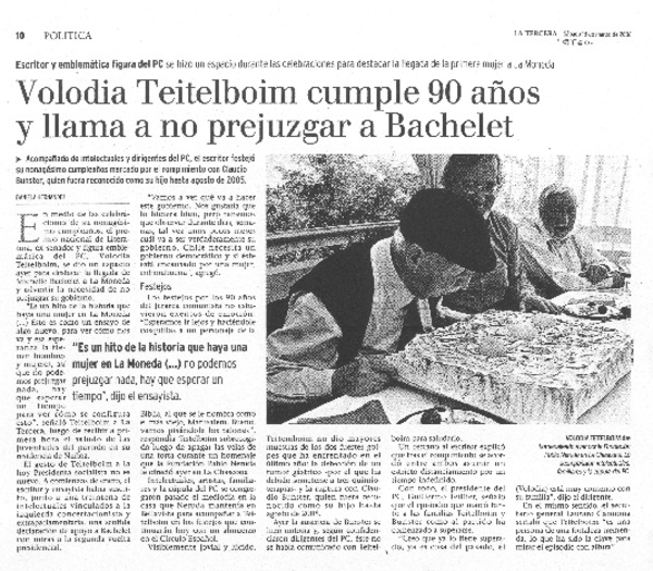 Volodia Teitelboim cumple 90 años y llama a no prejuzgar a Bachalet [artículo] Daniela Hernández.