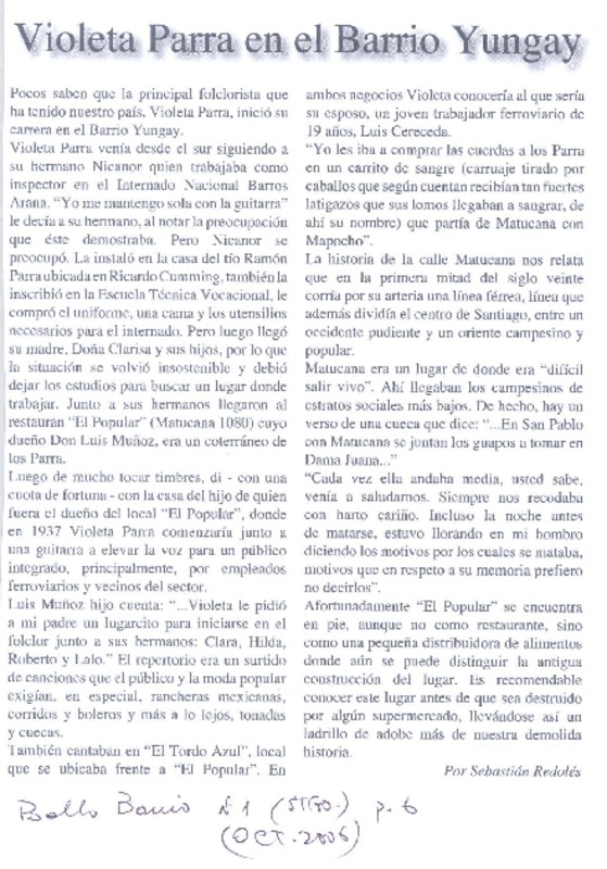 Violeta Parra en el Barrio Yungay [artículo] Sebastián Redolés.