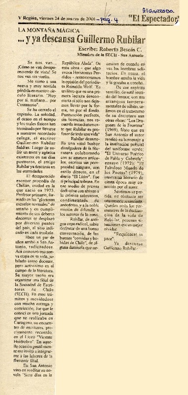...y ya descansa Guillermo Rubilar [artículo]Roberto Bescós C.