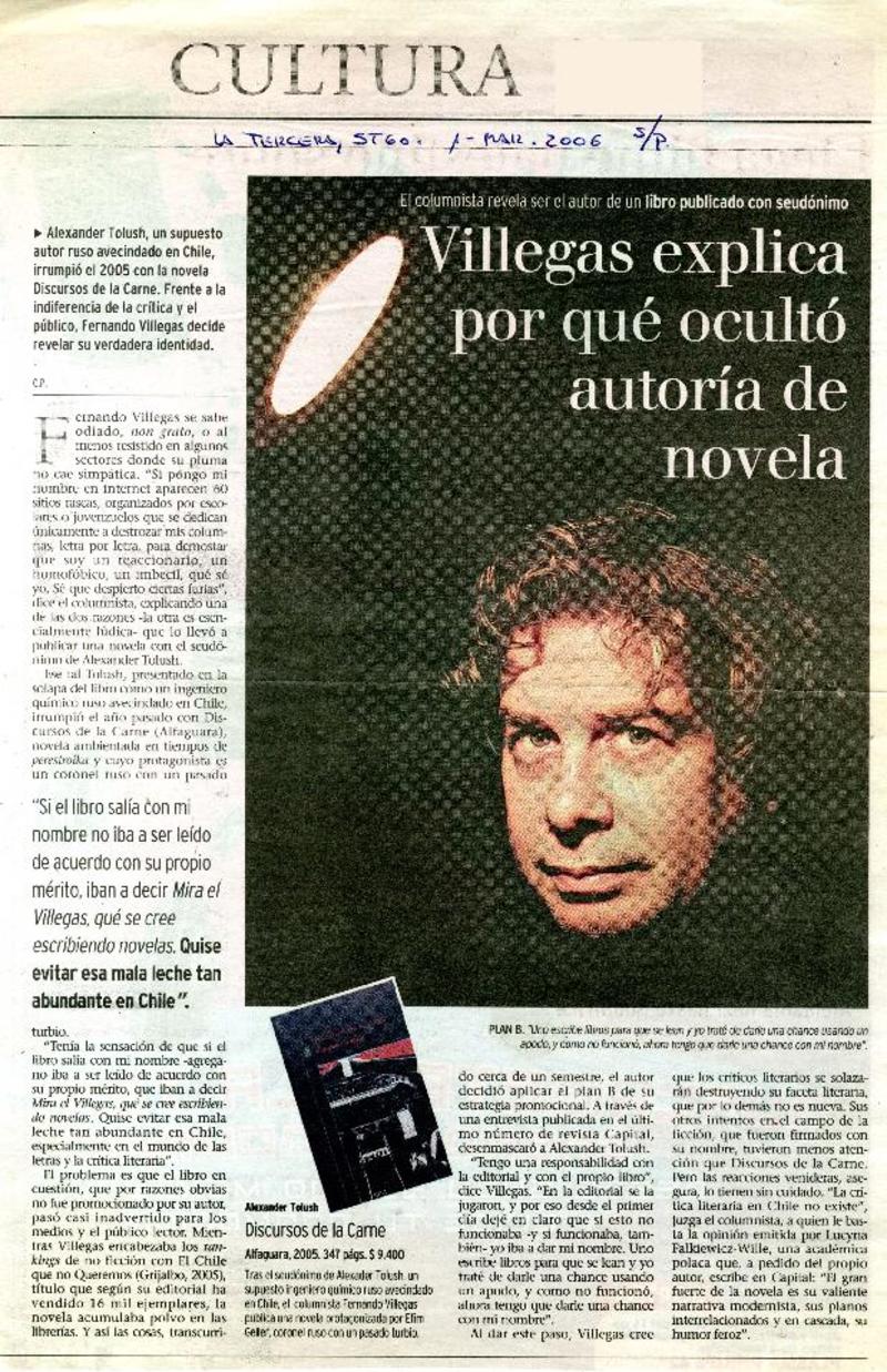 Villegas explica por que ocultó autoría de novela [artículo] C.P.