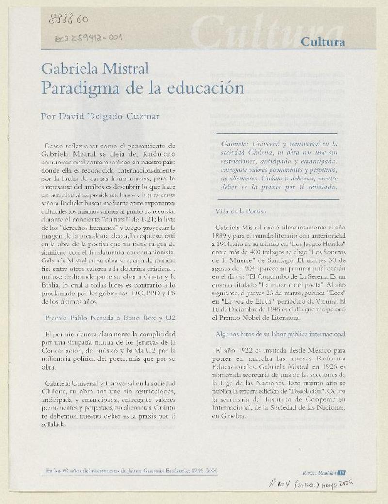 Gabriela Mistral paradigma de la educación [artículo] David Delgado Cuzmar.