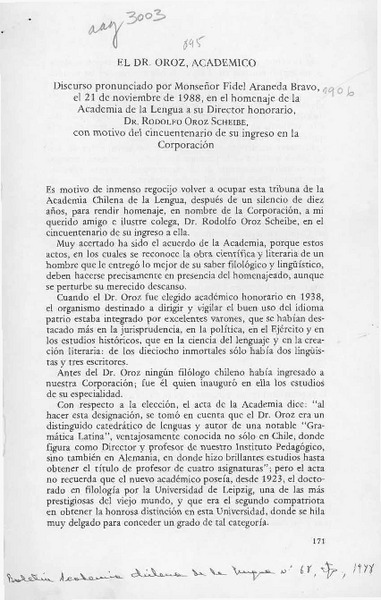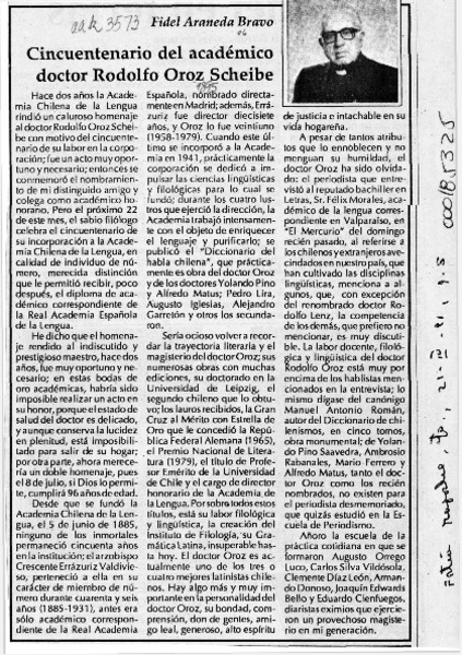 Cincuentenario del académico doctor Rodolfo Oroz Scheibe [artículo] Fidel Araneda Bravo.