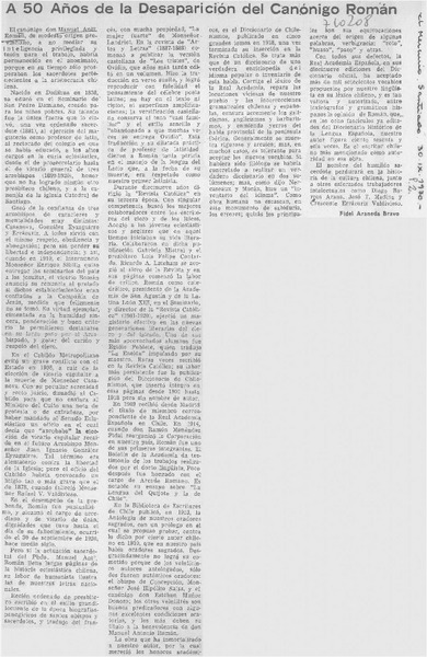 A 50 años de la desaparición del canónigo Román [artículo] Fidel Araneda Bravo.
